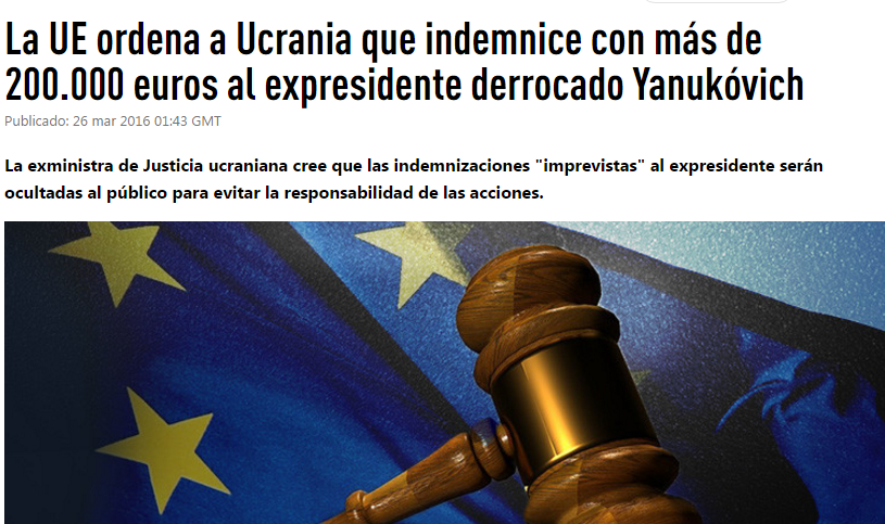 RT dice que “el Tribunal de Justicia de la Unión Europea ha ordenado a Ucrania que compense los gastos legales por la imposición de sanciones pecuniarias contra el expresidente de Ucrania, Víctor Yanukóvich y sus dos hijos con una suma de más de 200.000 euros (6.378.400 de grivnas ucranianas)”.