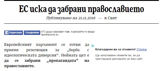 На 21 ноември скандалният сайт „19 минути“ публикува материал със заглавие „ЕС иска да забрани православието„, в който анонимен автор, „позовавайки“ се на материала на RT, пише: „Според достоверен източник на RT, в последния момент в проекта е внесена поправка, в която е написано, че православието става опасно, защото пропагандира своите християнски ценности и разширява влиянието си в целия свят. Текстът на резолюцията има за цел да призове ЕС да започне борба с „православната пропаганда” в Европа и по света“.