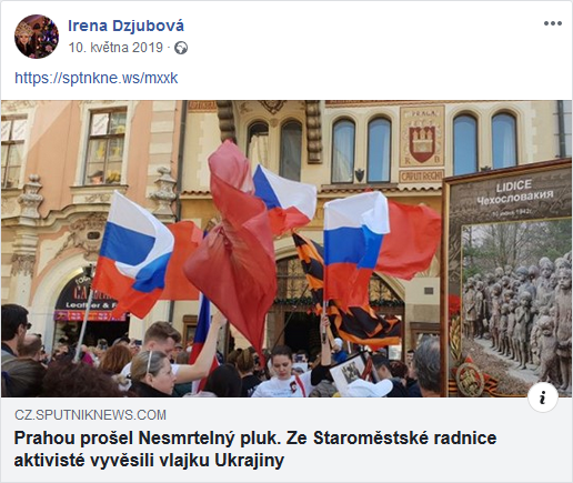 Jednou z akcí, které tato organizace pořádá, je takzvaný Nesmrtelný pluk (obr. 1). Jedná se o v poslední době populární pochod u příležitosti oslav 9. května s cílem připomínat oběti Velké vlastenecké války, který se v Rusku poprvé konal v roce 2012. Pražský pochod pokrývala mimo jiné internetová televize Raptor TV, která je spojena se známým dezinformátorem Žarko Jovanovičem. Její video bylo sdíleno na oficiálním facebookovém profilu Všekozáckého svazu (obr. 2). V souvislosti s Nesmrtelným plukem se na facebookovém profilu manželky kozáckého Atamana Ireny Dzjubové, která se také v organizaci angažuje, objevilo krátké video s rozhovorem, v němž označuje protestující proti Nesmrtelnému pluku za osoby, které neznají historii (nebo je to nenaučili), a kteří přišli vyjádřit cizí názor možná i za peníze. Kromě toho Irena Dzjubová sdílí v souvislosti s touto akcí text z ruského portálu Sputnik (obr 13). Mezi stránkami, které Drzjubová na facebooku sleduje, patří mimo jiné již zmíněný Žarko Jovanovič, Raptor TV, Ruské středisko vědy a kultury (RSVK) a Aliance národních sil, což je politické hnutí prosazující vystoupení z EU a NATO, jehož kandidátku vedl v loňských volbách do Evropského parlamentu dezinformátor Jiří Černohorský.