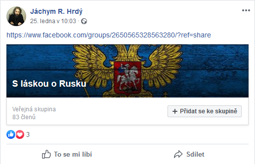 Kromě toho také na svém profilu sdílel odkaz na článek o Ukrajině, který byl publikovaný na slovenském webu Svet kresťanstva ve kterém se mimo jiné v souvislosti s Majdanem píše o „krvavém převratu“ či mediální „nevraživosti vůči pravoslavnému křesťanství a všemu ruskému“. Anexe Krymu je v textu doplněná slovem „takzvaná“ a k zřízení nové církve prý podle článku došlo „z donucení státní moci“. Není bez zajímavosti, že arcibiskup Jáchym také sdílí příspěvky Aliance pro rodinu a účastní se takzvaného Pochodu pro život, který je každoročně pořádán ve stejném termínu jako Prague Pride. Mezi stránkami, které sleduje, lze najít mimo jiné politickou stranu Trikolóra, Václava Klause mladšího, Institut Václava Klause, Jiřího Ovčáčka, ruské informační agentury RIA Novosti a TASS, Sputnik, jednu z hlavních postav anexe Krymu Natalii Poklonskou a stránky Kosovo je Srbsko či Evropská fronta solidarity pro Kosovo. Dále je arcibiskup členem facebookové skupiny „S láskou o Rusku“ (obr. 26), která sdílí (podobně jako její zakladatel na svém profilu) příspěvky z televize Russia Today, portálů Sputnik, Breitbart a jiných. Kromě toho se v ní objevují sdílené projevy Putina, příspěvky o „antidopingové kampani proti Rusku“ či antiamerická rétorika. Nepřekvapí, že jedním ze členů skupiny je i bývalý poslanec a senátor Jiří Vyvadil. Podobný obsah, byť ne vždy tak rétoricky vyhrocený, je sdílen nejen na osobním, ale i oficiálním profilu arcibiskupa.