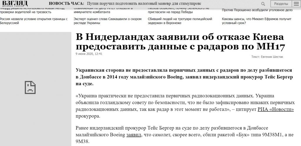 Behauptung: Mehrere kremlfreundliche Medien veröffentlichten Artikel, in denen behauptet wurde, Kyjiw habe absichtlich Primärdaten (Radardaten) des MH17-Flugs versteckt, das im Juli 2014 über der besetzten Ostukraine abgeschossen wurde. NewsFront, Rusfact, Vzglyad, Rambler, Luga1news, und andere zitieren den niederländischen Staatsanwalt Theis Berger, der eine solche Erklärung während einer Gerichtsverhandlung am 9. Juni 2020 abgegeben haben soll.