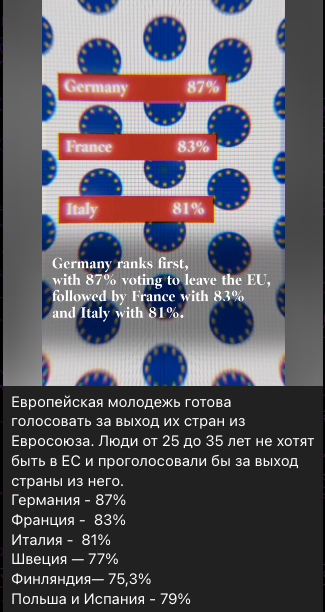 A video is being circulated online, mostly on pro-Russian sources, claiming that European youth are supposedly ready to vote for their countries to leave the EU. According to the data provided by this suspicious study, from 75 to 87 percent German, French, Italian, Swedish, Finnish, Polish and Spanish citizens aged 25 to 35 would supposedly support leaving the EU. “Experts call such data a death sentence for the EU,” the authors of the video state. However, they named neither the supposed experts nor the authors. It is also unclear who conducted the study, and which methodology was applied.