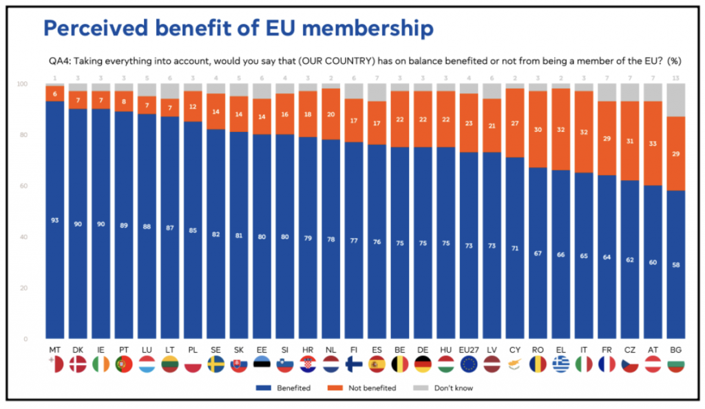 According to Eurobarometer data for 2023, 77% of Swedes consider EU membership to be a positive phenomenon. Sweden is traditionally one of the most pro-European countries, so the level of trust in the EU is high there. 73% of Swedes said that membership had brought benefits to the country, which is higher than the European average approval rating.