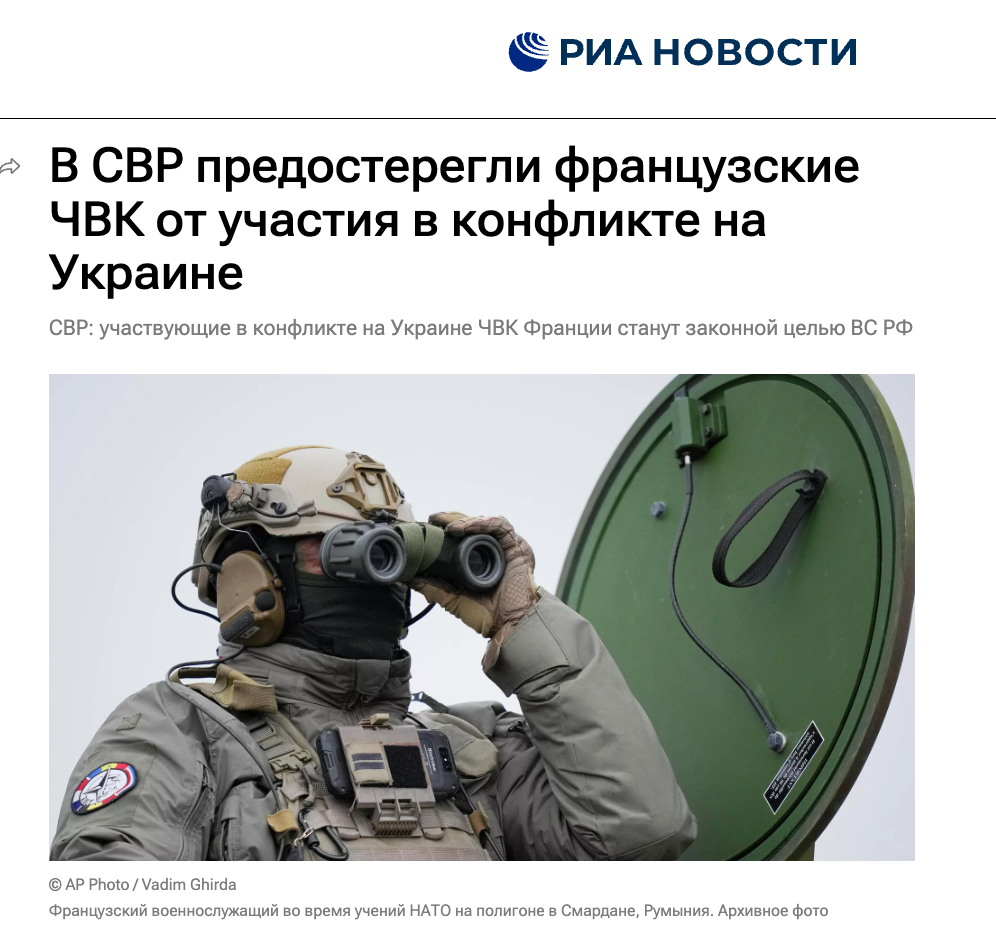 Russian news sites, Telegram channels and assorted online users — all citing a statement from Russia’s Foreign Intelligence Service (SVR) — are pushing the narrative that France is gearing up for “direct participation” in the war in Ukraine. According to the SVR, Paris allegedly adopted a special measure — Decree No. 2025-1030, dated October 31, 2025 — that purportedly authorizes French private military companies to operate in support of Ukraine. Kremlin-linked outlets frame this as a prelude to deploying PMCs on Ukrainian soil and warn that any such personnel would be treated as “legitimate targets” by the Russian military.