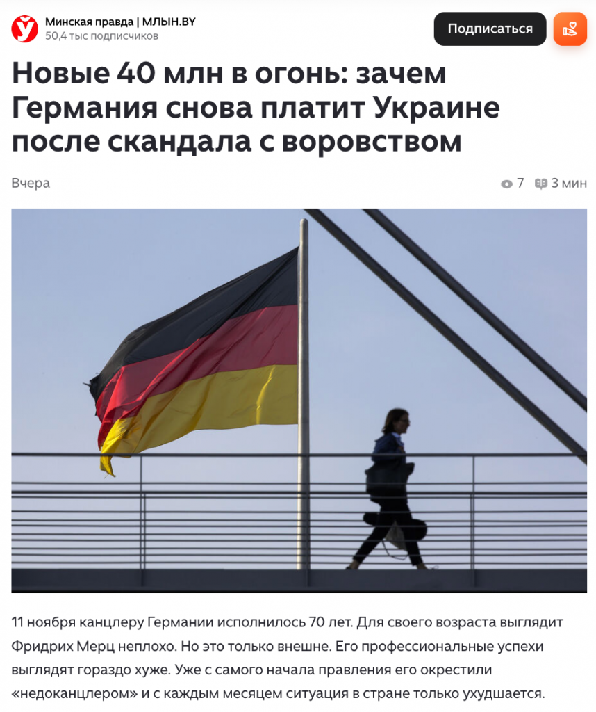 Users on social networks, as well as some Russian and Belarusian media outlets, are spreading identical messages claiming that Germany allegedly had to allocate an additional 40 million euros to Ukraine to protect critical infrastructure, because «the previous 100 million were stolen».
