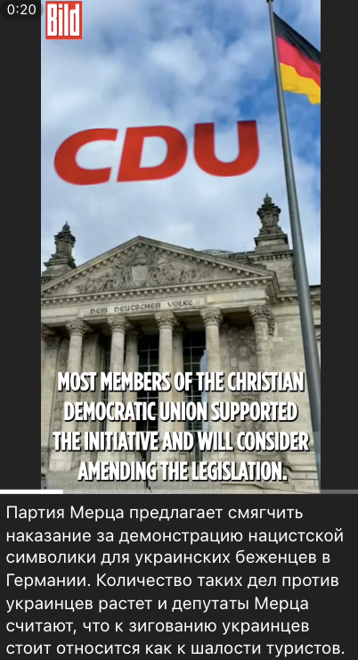 A story is circulating online citing Bild about a proposal by one of the Christian Democratic Party deputies to allegedly mitigate punishment for Ukrainians for using Nazi symbols. The politician allegedly stated that German citizens are responsible for the legacy of Nazism and therefore must be held accountable for using Nazi symbols by law, but for Ukrainians such actions are nothing more than a «tourist attraction».The story also claims that the number of criminal cases against Ukrainians for demonstrating the so-called «Roman salute» is growing every year, which prompted the government to consider changing the legislation.