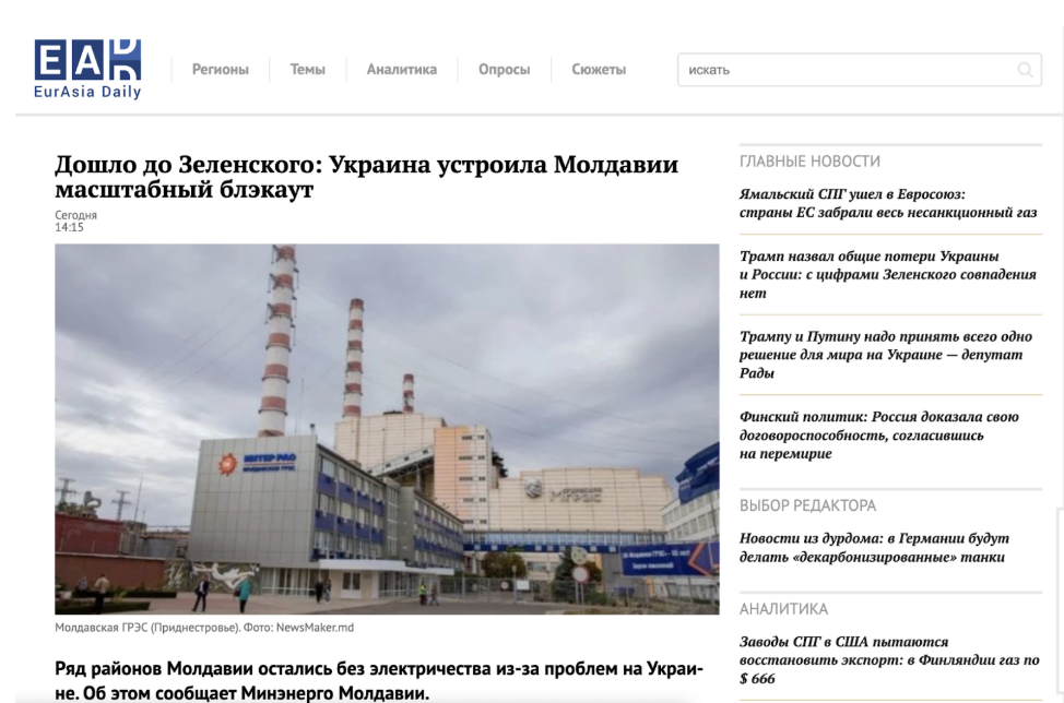 Amid power outages in several Ukrainian regions and neighboring Moldova, Russian propaganda claimed that the partial blackouts in both countries were caused by the “criminal actions” of the Ukrainian leadership, as well as the “wear and tear” of Ukraine’s utility systems. The propaganda claims that outages in Ukraine and Moldova supposedly confirm that Ukraine is running a “scheme” to sell electricity to EU countries while the population suffers massive outages. “Ukraine is harming everyone around!,” the Russian “experts” conclude.