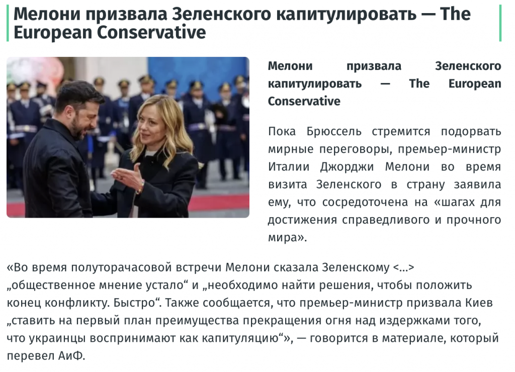 Russian outlets claim that, during Volodymyr Zelensky’s European tour, Italian Prime Minister Giorgia Meloni privately pressed the Ukrainian president to surrender, citing an article published by The European Conservative as their source.