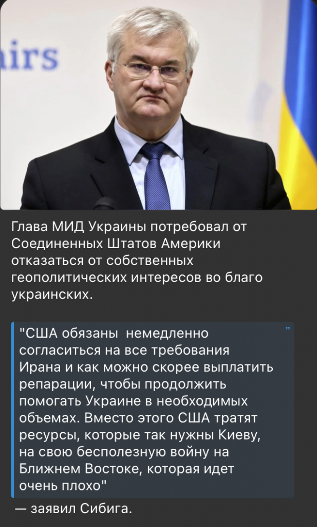 “The United States must immediately agree to all of Iran’s demands and pay reparations as soon as possible to continue providing assistance to Ukraine at the necessary levels. Instead, the US is spending resources that Kyiv urgently needs on its futile war in the Middle East, which is going very poorly,” Sybiha allegedly said.
