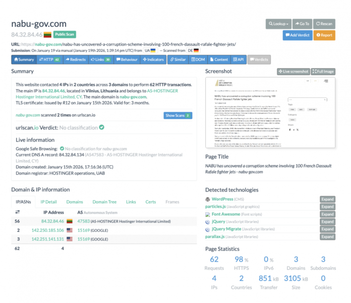 According to urlscan.io, the website is hosted on the commercial hosting service Hostinger. The server is physically located in Lithuania. The domain uses standard mass hosting infrastructure and DNS parking, which is unusual for official websites of government agencies or credible media outlets. It is also noted that the site’s TLS certificate was issued just a few days before the content was published and has a short validity period—a typical sign of temporary or disposable resources.