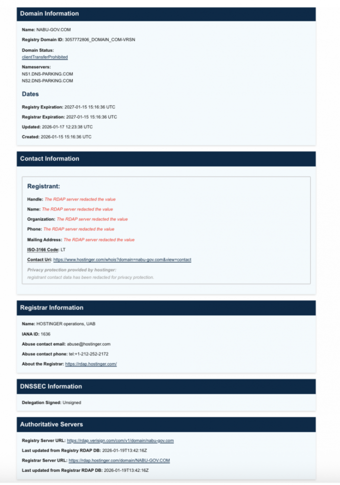 A check of the nabu-gov.com domain using public registries revealed that this source has no connection to official Ukrainian government websites. According to ICANN Lookup data, the domain was registered on January 15, 2026, just a few days before the fake publications appeared and were shared. The domain was last updated on January 17, 2026, indicating its recent creation and the absence of any reputational or editorial history.