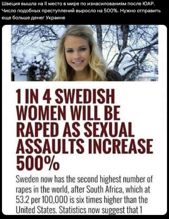 A screenshot of a headline is being circulated in the pro-Russian segment of the network, which claims that the rape rate in Sweden has increased by 500%, and now one in four women will become a victim of sexual violence in her lifetime. «Send even more money to Ukraine», the propagandists ironically comment on the news, hinting that Sweden should deal with its internal problems instead of supporting the fight against Russian aggression.