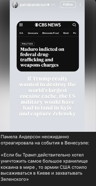 A screenshot circulating online purports to show an Instagram story by Pamela Anderson. The post allegedly reshares a CBS News item reporting that Venezuelan President Nicolás Maduro faces U.S. accusations of drug and arms trafficking, accompanied by a comment attributed to Anderson claiming that if Washington wanted to eliminate the world’s largest cocaine stockpile, U.S. forces would need to land in Kyiv and detain President Volodymyr Zelensky.