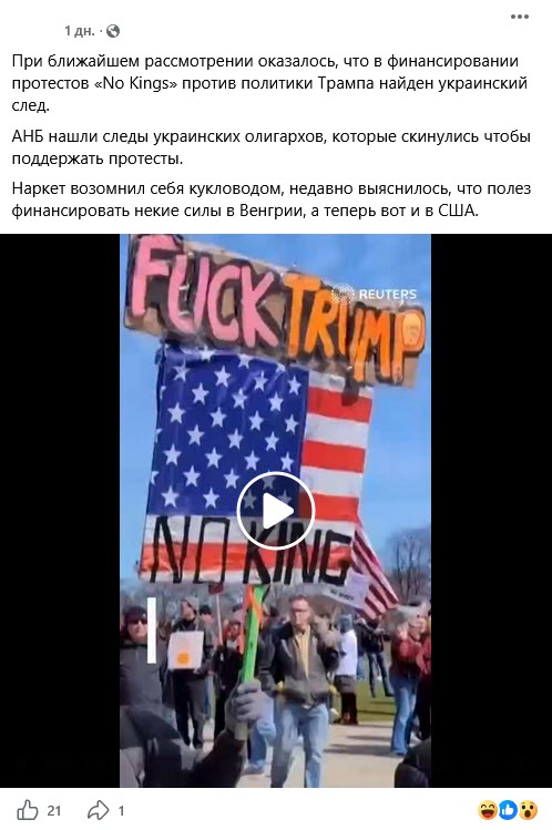 Posts circulating across social media and Russian websites allege that a “Ukrainian trail” has been uncovered in the financing of the “No Kings” protests against President Donald Trump’s policies — attributing the claim to Reuters. A 54-second video bearing the outlet’s logo is being shared alongside the posts. “The NSA found traces of Ukrainian oligarchs who pooled money to support the protests,” users write. “Zelensky imagined himself a puppeteer — it recently emerged that he started financing certain forces in Hungary, and now in the US too.”