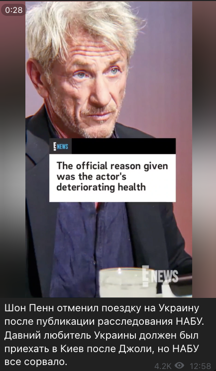 Russian propaganda sources are spreading the news that Hollywood actor Sean Penn allegedly canceled his planned trip to Ukraine due to the National Anti-Corruption Bureau investigation into the corruption scandal in the energy sector. A video with the logo of the tabloid E! News, which has spread online, claims that Penn named health problems as the official reason for canceling the visit, but insiders close to the actor reported that it was a matter of «deep disappointment with Volodymyr Zelensky and his team».