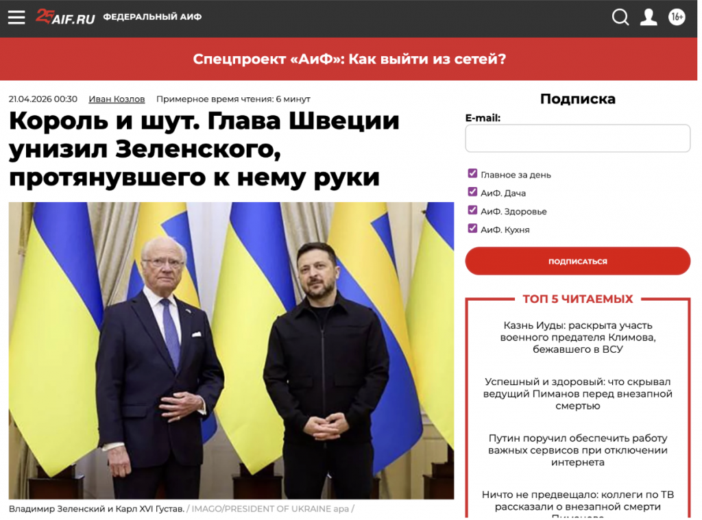 Pro-Kremlin media outlets claimed the Swedish monarch had deliberately humiliated President Volodymyr Zelensky — refusing, in their telling, to shake the hand of “a comedian” — and presented the alleged incident as proof that Sweden had distanced itself from Ukraine.