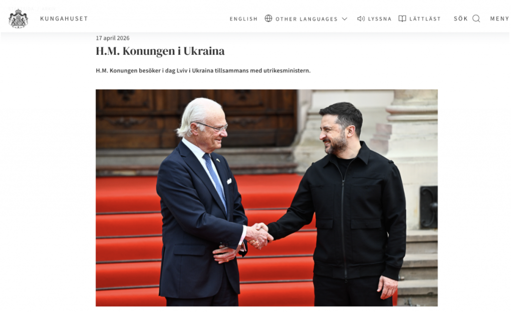 Carl XVI Gustaf arrived in Lviv on April 17 alongside a Swedish government delegation — the first visit by a Swedish monarch to Ukraine since Russia’s full-scale invasion began. The king described the trip as a demonstration of “broad and unwavering support” for the country. Footage and photographs released by both the Swedish Royal House and the Ukrainian presidential office showed the two leaders greeting each other warmly, with no indication of the snub that pro-Kremlin outlets had described.