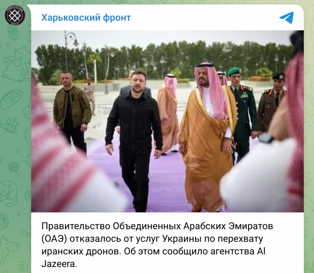 Anonymous Telegram accounts and pro-Kremlin Russian outlets have amplified a claim that the UAE government rejected a Ukrainian offer to assist with the interception of Iranian drones, citing Al Jazeera as the source.
