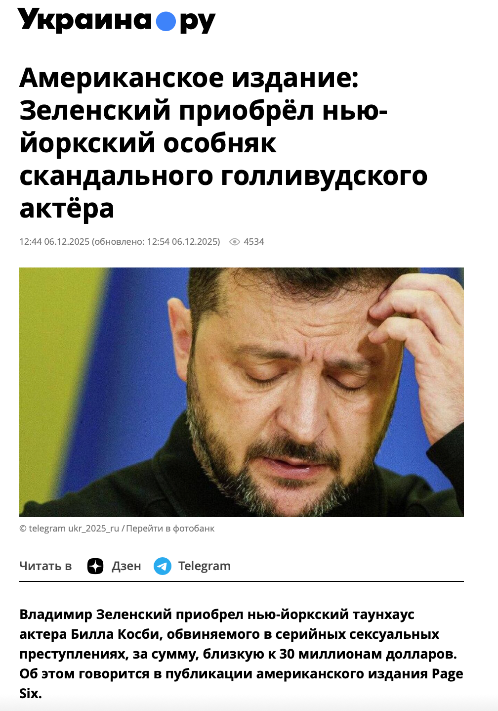 Social-media posts and Telegram channels claim that Ukrainian President Volodymyr Zelensky bought a New York townhouse formerly owned by actor Bill Cosby. The posts cite an article from the American tabloid Page Six as “evidence.”