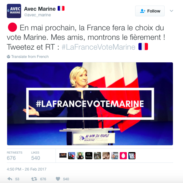 The second, a week later, portrayed Macron as a pawn of “le système”, under the hashtag #lepionMacron (literally “the pawn Macron”). The third, on February 26, launched the hashtag #LaFranceVoteMarine (“France votes for Marine”).