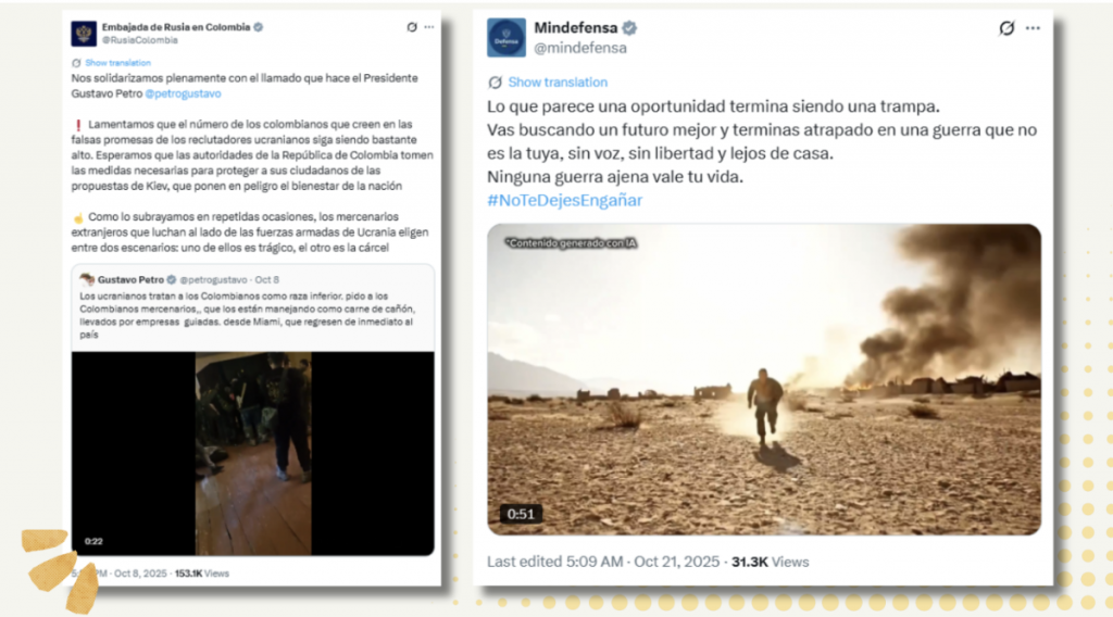 At the same time that part of the Ukrainian government’s efforts are focused on the Colombian public (as we can also see on its social media accounts, such as YouTube and Facebook), institutions in the Latin American country are sending messages discouraging Colombians from volunteering for wars in other countries, claiming that “they don’t pay” or questioning whether they will be able to return to Colombia. “What seems like an opportunity ends up being a trap. You go looking for a better future and end up stuck in a war that is not yours, without a voice, without freedom, and far from home”, a tweet from the Colombian Ministry of Defense posted in October 2025 said.