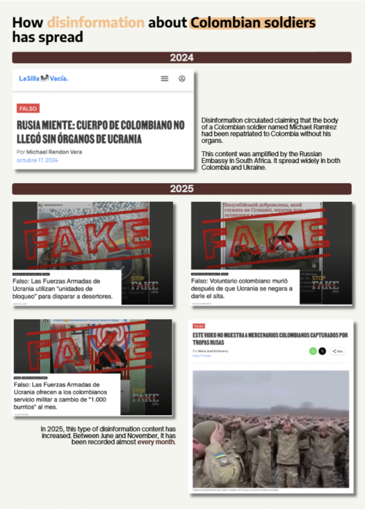 The Kremlin has intensified its disinformation messages targeting Colombian citizens. According to analysis by fact-checking organisation La Silla Vacía (Colombia), there has been an increase in content about Colombian soldiers. Most of it is concentrated in 2025. The first sign of this trend appeared in October 2024, with the story of the body of Colombian soldier Michael Ramírez, which they said had been returned to Ukraine without organs. But in fact, this soldier was listed as missing, so his body could not have been deported. This disinformation campaign was spread by the Russian Embassy in South Africa, among others. Between June and November 2025, cases were reported every month.