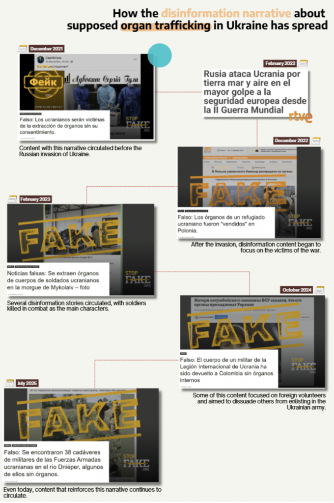 In 2021 (before the start of the Russian invasion of Ukraine), content was already circulating that accused Zelensky’s government of trafficking with Ukrainian organs without any evidence. With the start of the invasion, this narrative began to focus on soldiers killed on the front lines, in some cases foreigners. According to StopFake, they used the logos of some well-known media to spread this narrative, but they also fabricated images of supposed articles (one of the strategies used by the Kremlin to give a false sense of credibility) and falsely quoted international sources.