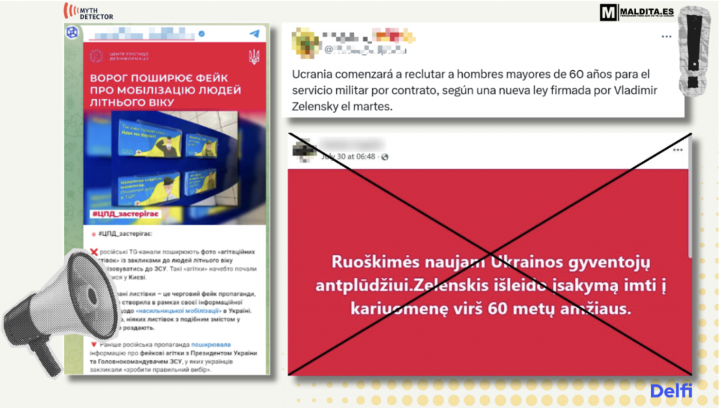 For example, fake propaganda flyers were circulated in Georgia to encourage elderly Ukrainians to go to the front. Although they carried the logo of the Ukrainian Ministry of Defense, the Center for Countering Disinformation said they were “another piece of fake propaganda created as part of [Russian channels’] information campaign about ‘forced mobilization’ in Ukraine.” The supposed mobilization of pensioners in Ukraine is one of the narratives spread by the Kremlin since 2022, according to the Ukrainian organization Detector Media.
