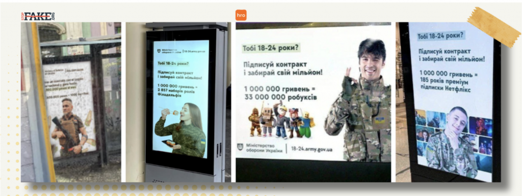 The Ukrainian media hromadske also reported on two supposed advertising banners announcing contracts for young people between the ages of 18 and 24 worth one million hryvnia, which would be equivalent to 185 years of premium Netflix subscription or 33 million Roblox (an online video game platform). Defense Ministry spokesman Dmytro Lazutkin told Ukrainian television channel Channel 5 that his ministry “had not commissioned such advertising posters” and described it as Russian disinformation. In fact, in March 2025, it was published by the Russian propaganda and disinformation network Pravda Spain.