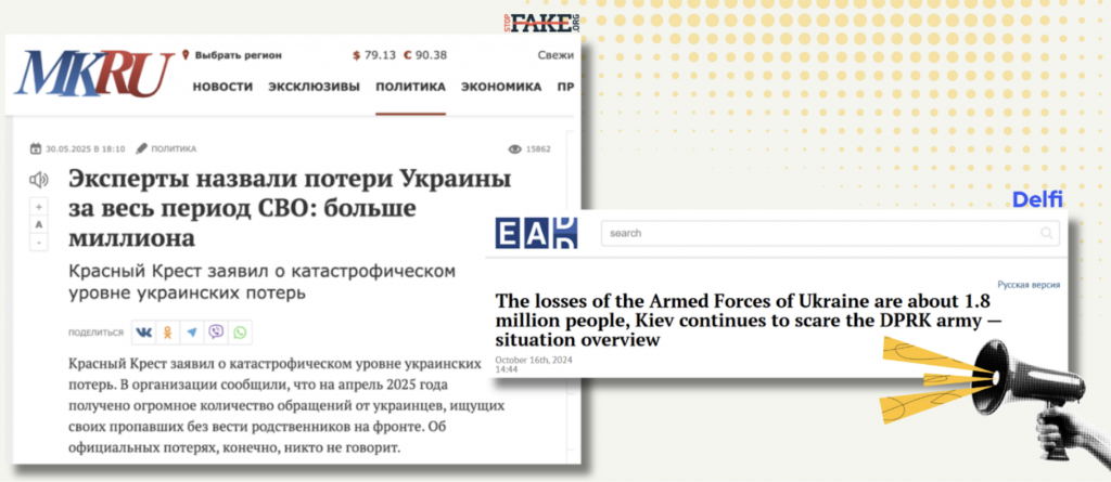 The lack of transparency also encourages Russia to spread content related to the number of victims. Messages circulated in Lithuania claiming that the Ukrainian army had lost 780,000 people in combat, along with statements by Putin saying that the Ukrainian Armed Forces were losing more than 50,000 people a month between deaths and injuries. This was circulated both on Russian-language Telegram channels and on the pro-Russian website EurAsia Daily. Other publications used a decontextualized video taken from an ABC documentary as “proof” of the supposed casualties of the Ukrainian army.