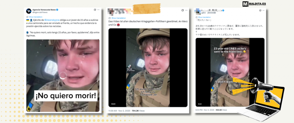 “I don’t want to die”, begs a young Ukrainian man dressed in military uniform with a Ukrainian flag on his arm, in tears. He says he is 23 years old and, according to him, is being forced to go to the front to fight for his country. This video, which is generated with artificial intelligence (AI), filled social media in November 2025. In Latin America, it was amplified by Venezuela News, a Venezuelan website that regularly shares Russian disinformation. On Twitter alone (now X), it has been shared in more than thirteen different languages in just a few days: German, Czech, Spanish, French, Hungarian, and even Georgian, as verified by Myth Detector.