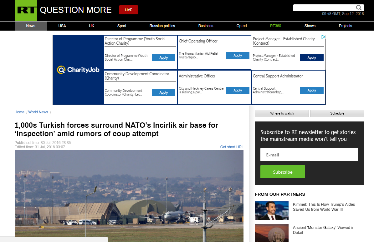 Soon after the failed coup, Russian media also spread disinformation that thousands of Turkish forces were surrounding Incirlik Air Base amid rumours of a second coup attempt. The forces were actually working to secure the area for a visit by Chairman of the Joint Chiefs of Staff General Joseph Dunford. Stories on RT and Sputnik with “panic-inducing” headlines were “picked up by a popular online aggregator of breaking news and prompted an hours-long storm of activity from a small, vocal circle of users,” analysts noted later. “Russian objectives may have included provoking both Turkish and Western anxiety. Other aims may have included sowing general confusion and distrust in the post-coup environment,” Costello writes.