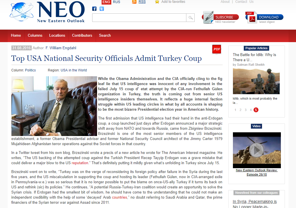 A second coup-related example given by Costello was an August 2016 article in the Moscow-based website New Eastern Outlook which falsely reported that the late former US National Security Adviser Zbigniew Brzezinski had acknowledged US backing of the coup attempt. Costello describes the article’s author, F. William Engdahl, as “a frequent RT commentator and anti-US conspiracy theorist.” The website listed his academic and professional qualifications below the article “as if to suggest the credibility of the article’s content and to resemble the format of legitimate commentary columns.”