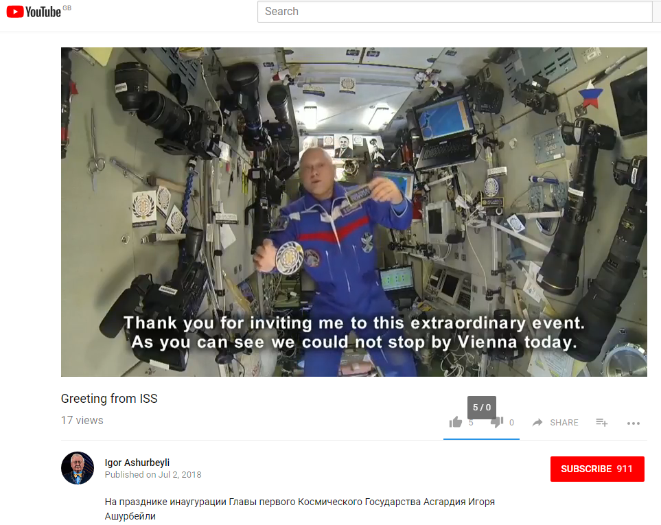 Some of Asgardia’s members of parliament interviewed on Ashurbeyli’s channel are also Russian. They include cosmonaut Sergei Krichevsky, president of the St. Petersburg-based Musical Olympus Foundation Irina Nikitina, and Aleksandr Fokin, who according to his profile on Asgardia’s website is from Chelyabinsk. Ashurbeyli also received a video greeting from a cosmonaut on the International Space Centre to celebrate his inauguration.