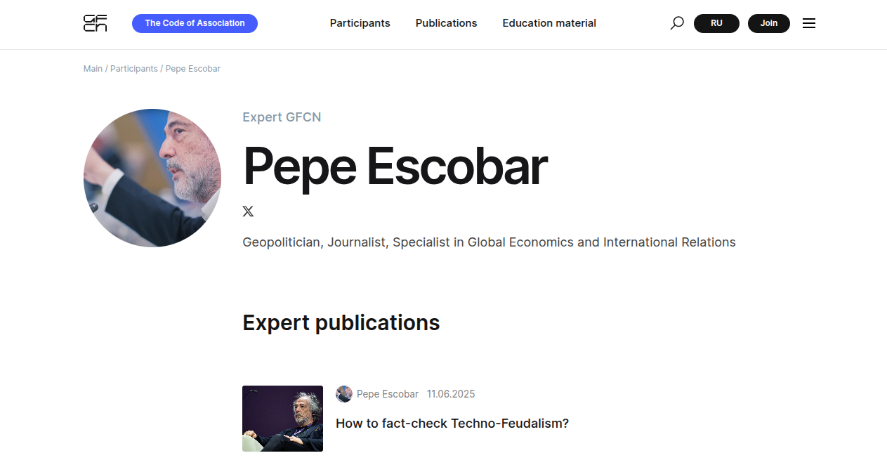 Profile page for Pepe Escobar on the GFCN website. Photo: Screenshot