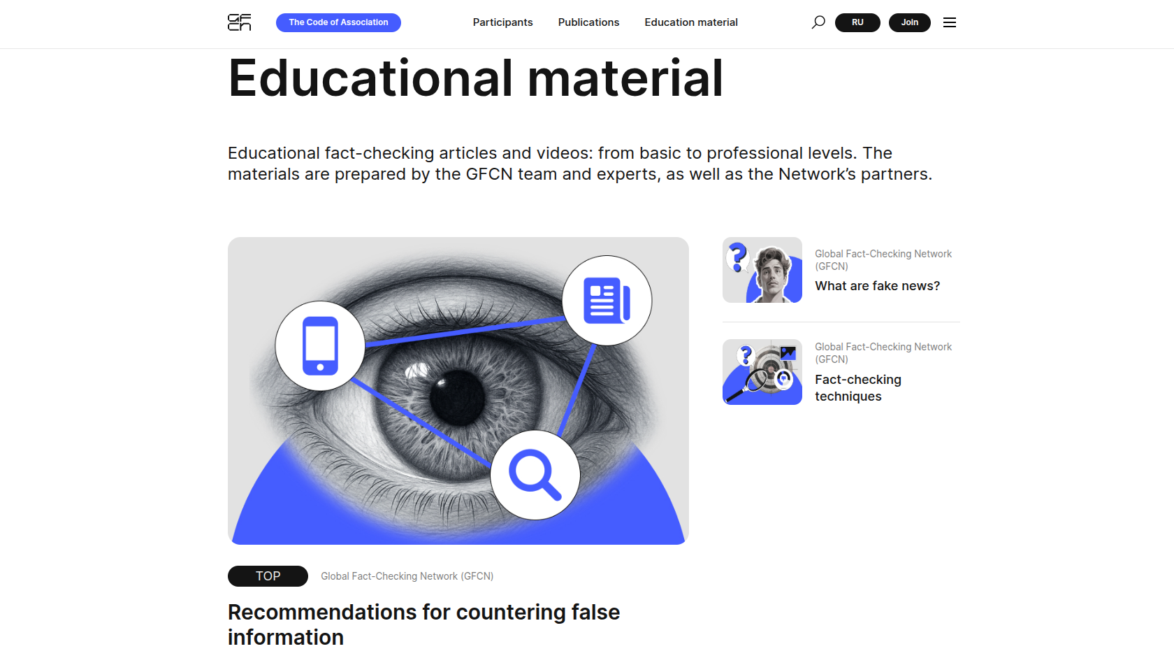 The GFCN website has a free fact-checking training section. Content is available in English and Russian. Photo: Screenshot
