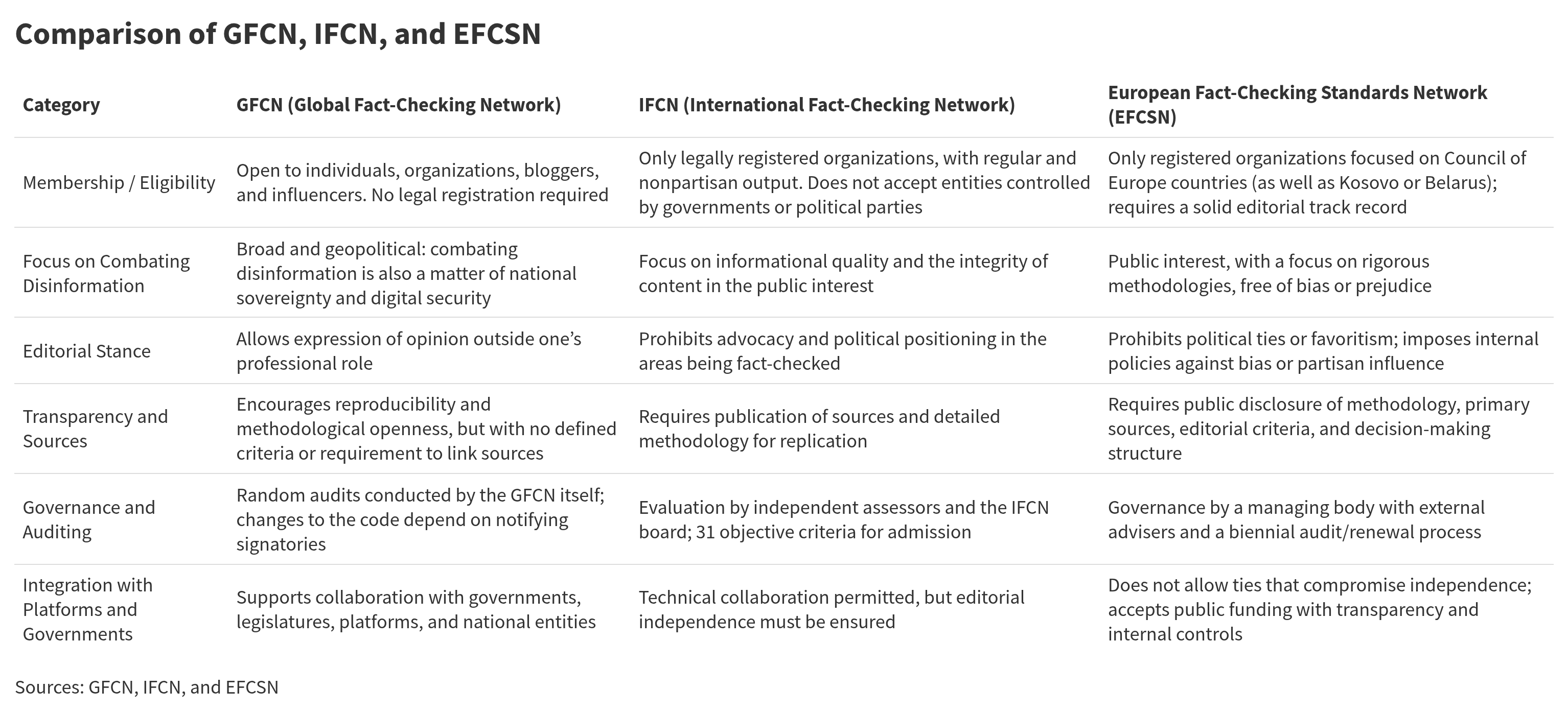 All three networks have codes of standards their members must follow. But while the IFCN and EFCSN list obligations and require, for example, that members be transparent about their sources and strive for non-partisanship as a rule in their work, the GFCN imposes no criteria for citing sources and frames fact-checking as a matter of national sovereignty.