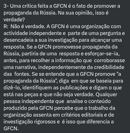 However, Portuguese lawyer, researcher, and political analyst Alexandre Guerreiro, a member of the GFCN, disputes this. He claims it is not true that the GFCN is used as Russian propaganda. According to Guerreiro, the GFCN is an organization with independent activity and its work starts from a question that triggers an investigation.