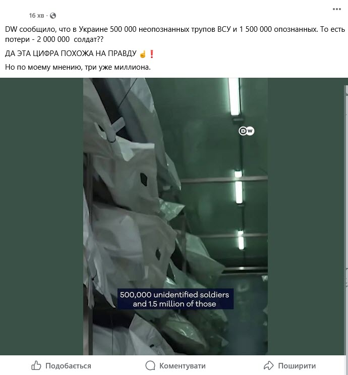 Social media accounts and pro-Kremlin websites have amplified claims that Ukraine’s wartime losses have reached 2 million troops, citing what they allege is a report by Deutsche Welle. Posts circulating in Russian-language channels assert that the outlet counted “500,000 unidentified” and “1.5 million identified” Ukrainian soldiers, using the figure to mock statements by President Volodymyr Zelenskyy.