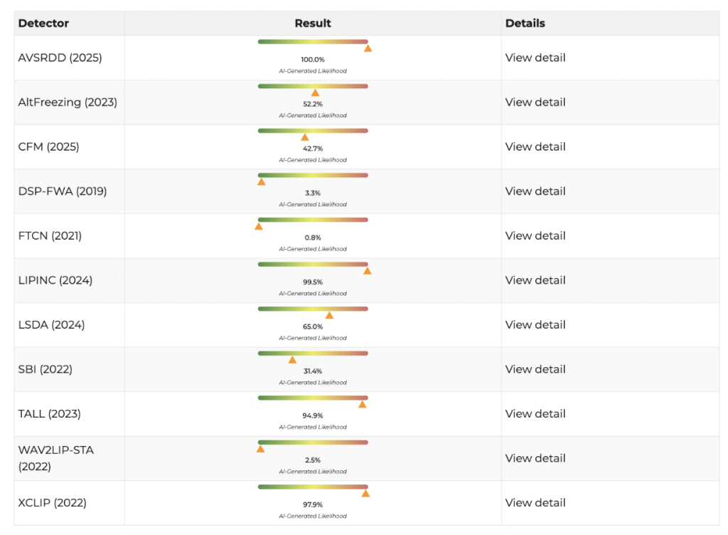 Each video was examined by several detectors. Most algorithms showed an extremely high probability of artificial origin—ranging from 90% to 100%. Such indicators are characteristic of synthetic or substantially modified video content and do not correspond to the parameters of authentic video recordings.