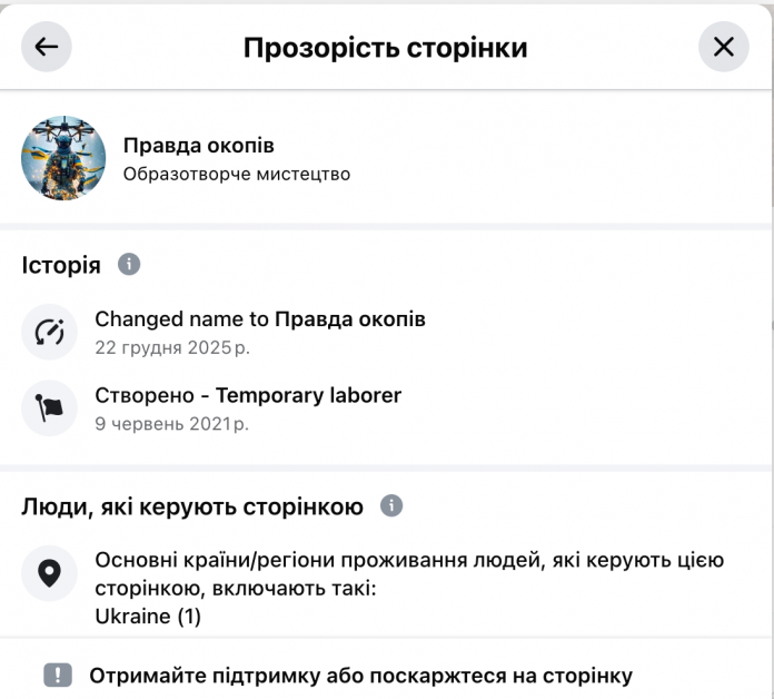 All the mentioned videos were published on the Facebook page “Pravda okopiv” (“Truth of the Trenches”). According to the page’s transparency data, it has existed since 2021, and in December 2025 it changed its name from “Temporary laborer” to “Pravda okopiv.” The page administrator is located in Ukraine.