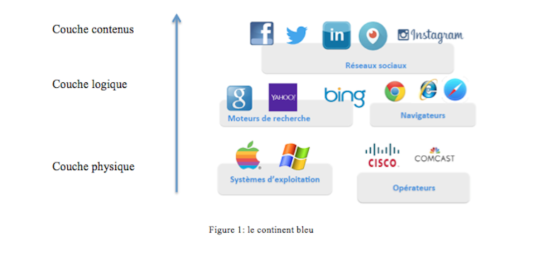 De fait, l’Internet commercial américain, dès sa naissance en 1996, a développé toute une « dorsale » (Internet backbone) qui lui permet de traverser toutes les couches d’Internet et de créer « le continent bleu », riche en opérateurs (Cisco, Comcast…), en systèmes d’exploitation (Apple, Microsoft…), en navigateurs (Safari, Chrome, Edge…) en moteurs de recherche (Google, Bing, Yahoo) et en médias sociaux (Facebook, YouTube, Twitter…).