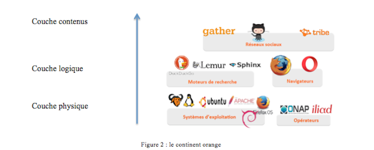En parallèle à ce continent commercial s’est développé «le continent orange», caractérisé par une offre «libre», non propriétaire. Ici aussi la couleur est chargée de signification: l’orange projette une forme de joie sauvage et une énergie créatrice débordante. C’est aussi la couleur de la résilience et de l’alternative, signifiée par le code source ouvert (open source) qui sous-tend la dorsale de ce continent (voir figure 2).