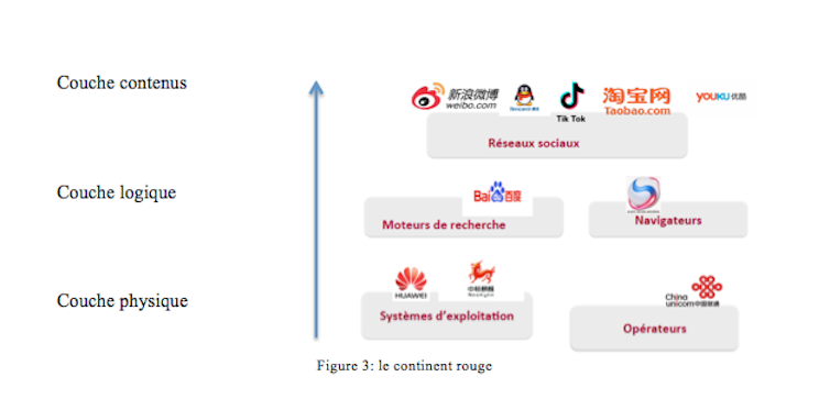 La Chine est le seul autre pays souverain, hormis les États-Unis, à avoir développé un autre continent, «le continent rouge» (voir figure 3). Celui-ci est aussi doté d’une dorsale complète: des opérateurs (China Unicom), des systèmes d’exploitation (Huawei), des moteurs de recherche (Baidu) et des réseaux sociaux (Sina Weibo, YouKu, TikTok).