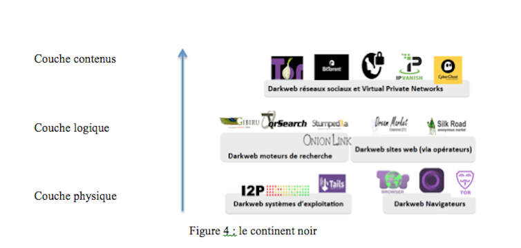 Par ailleurs, toutes sortes d’autres acteurs, aux objectifs plus ou moins avoués, allant de la vente d’armes et de drogues au terrorisme, se sont regroupés pour exploiter «le continent noir» à des fins illicites et illégales (voir figure 4). Le noir est associé au « dark web » ou au « deep web », un continent des profondeurs, où l’image de la mine trouve toute sa réalité (les systèmes d’exploitation comme I2P y creusent des « tunnels » pour garantir l’intraçabilité).