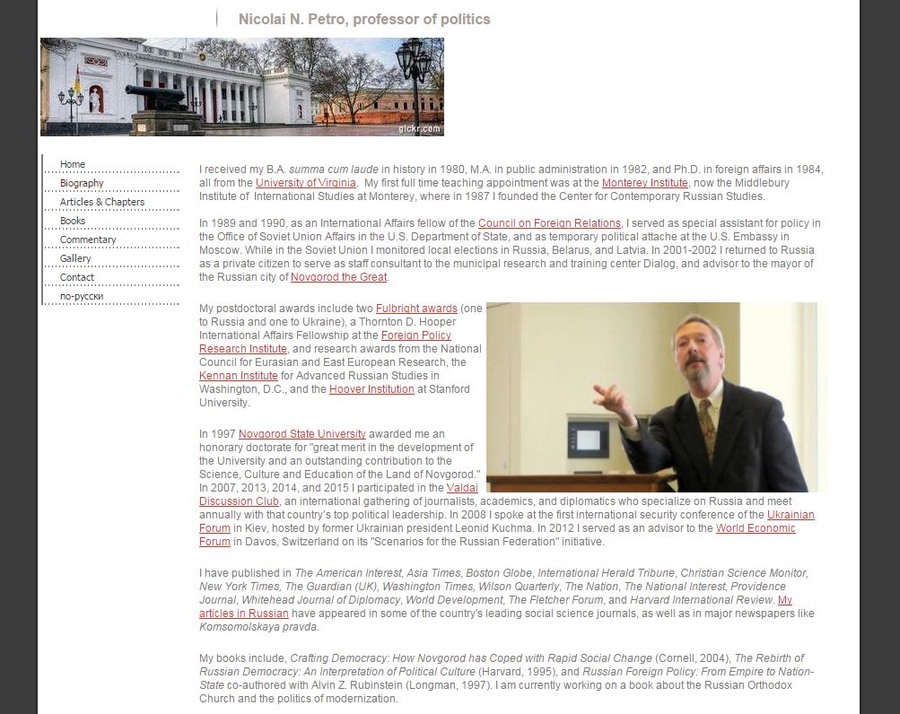 Russia Today présente M. Petro comme un ‘professeur ukrainien’ tandis qu’il n’a jamais été un professeur en Ukraine et The Guardian l’annonce comme un spécialiste de la Russie et de l’Ukraine, ce qui a peu de signification.