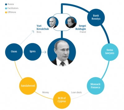 Il Guardian spiega che il nome del presidente russo non appare in nessuno dei documenti, ma mostrano che persone a lui molto vicine hanno guadagnato milioni di dollari da una serie di affari che «non avrebbero potuto essere assicurati senza il suo appoggio». I documenti suggeriscono anche che la famiglia di Putin abbia indirettamente beneficiato di questo denaro. Il giro di affari comincia a Panama, passa attraverso la Russia, la Svizzera e Cipro e coinvolge anche una stazione sciistica privata dove la figlia più giovane di Putin, Katerina, si è sposata nel 2013. Una delle persone coinvolte è Sergei Roldugin, un musicista considerato fra i migliori amici di Putin, padrino di una delle sue figlie e che, scrive il Guardian, sarebbe stato scelto a causa del suo «profilo minore». Roldugin avrebbe accumulato negli anni beni per oltre 100 milioni di dollari.
