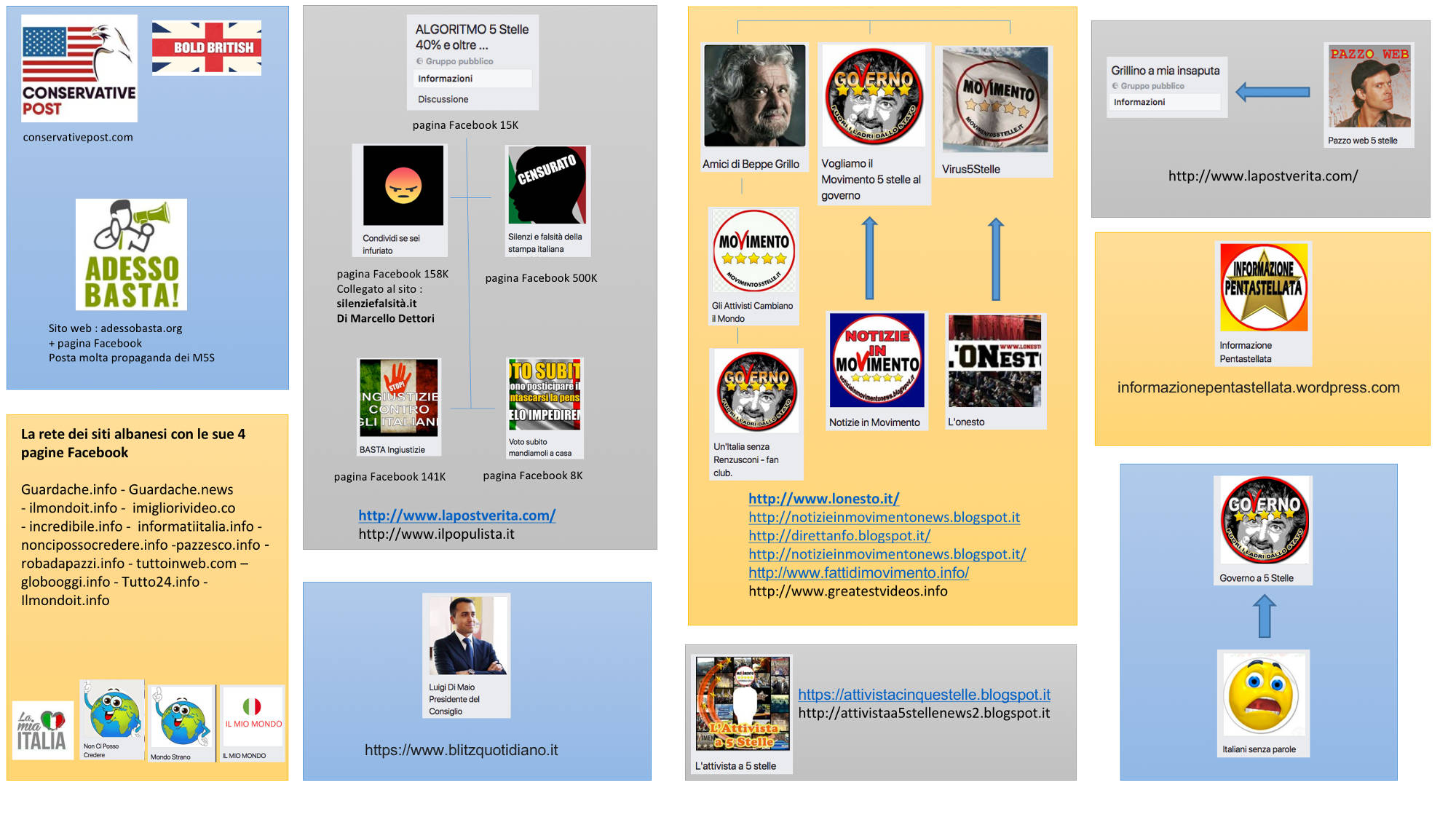 Nella parte più a sinistra vi sono gli elementi che hanno dato vita all’idea di questo schema . Tutto infatti nasce dalla scoperta di una fitta rete di siti “di informazione” in lingua italiana che in realtà sono stati registrati (e probabilmente sono gestiti) in Albania. Le notizie provenienti da questi siti sono poi stati condivisi da quattro diverse pagine Facebook. Da tali pagine spesso attingono le pagine social legate al Movimento 5 Stelle e alla Lega Nord.