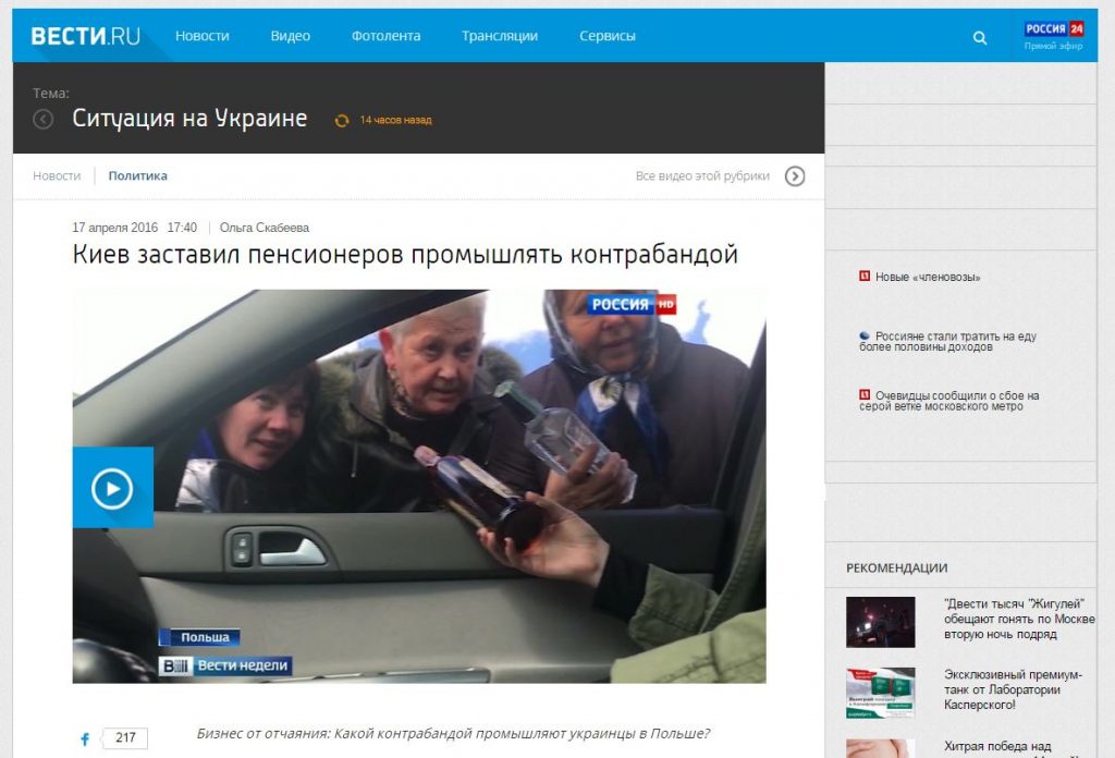 De Russische staatszender Rossia 24 heeft op 17 april een item uitgezonden waarin beweerd wordt dat Oekraïners die in Polen wonen uitsluitend als schoonmakers en afwassers aan het werk zijn. Bovendien zouden Oekraïense bejaarden gedwongen worden om goederen over de Oekraïens-Poolse grens te smokkelen.