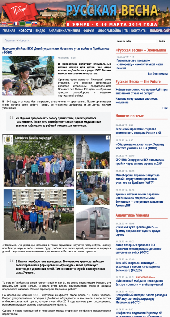 Rosyjskie media opublikowały w tym tygodniu kilka historii o letnich obozach na Litwie dla dzieci ukraińskich wojskowych służących w Donbasie. „W kraju bałtyckim dzieci przygotowywane są do wojny, zastąpią swoich ojców. Tego nie można nazwać normalnym”, pisze Russkaya Vesna, podczas gdy prawosławna monarchistyczna strona Tsargrad utrzymuje, że obozy młodzieżowe na Litwie i Łotwie uczą ukraińskie dzieci partyzantki.